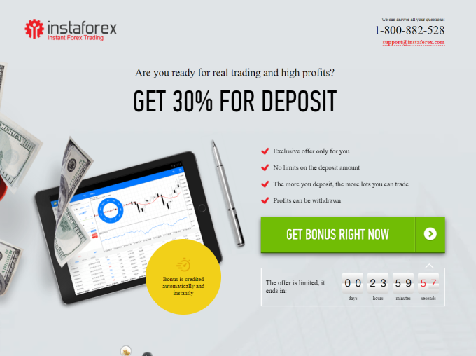 इंस्टा फॉरेक्स ग्राहकों के लिए केवल लाभकारी प्रस्ताव। अपने ट्रेड खाते में निधि दें और अपने जमा को +30% पाएं। जमा हुई राशि एक बड़े वॉल्यूम के ट्रेड करने का एक अवसर प्रदान करती है। बोनस को किसी भी जमा के लिए तुरंत प्रदान किया जाता है, कोई सीमा नहीं है।