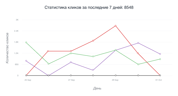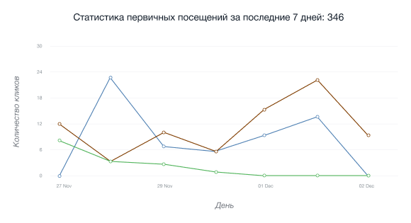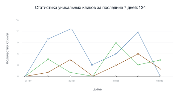 • Графік унікальних кліків по партнерському посиланню показує число відвідувачів, які вперше перейшли за ним з певної IP-адреси протягом останніх 24 годин.