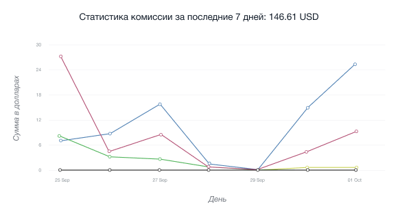• Графік показує загальне число переходів усіх рефералів за вашим партнерським посиланням та партнерськими мітками за обраний період часу.